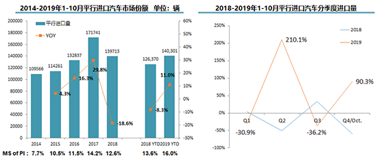 相比之下,平行進(jìn)口市場則實(shí)現(xiàn)逆勢(shì)上揚(yáng)。1-10月,平行進(jìn)口汽車?yán)塾?jì)進(jìn)口14.0萬輛,同比增長11.0%,占進(jìn)口總量的16.0%,創(chuàng)歷史新高。流通協(xié)會(huì)認(rèn)為,這主要是受國六實(shí)施等政策的影響。