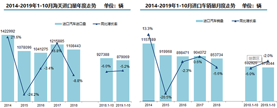 同比微降2.0%,降幅相比2018年收窄3.6個(gè)百分點(diǎn)。其中,受2018年關(guān)稅稅率下調(diào)和國六實(shí)施影響,進(jìn)口車銷量大起大落,在二季度增長22.1%之后,市場再次進(jìn)入下行通道。