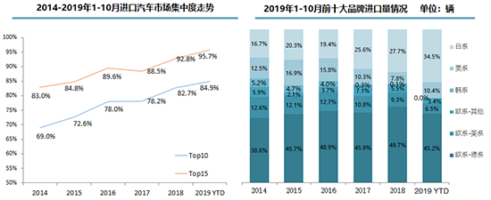 隨著品牌結(jié)構(gòu)的深度調(diào)整,進(jìn)口車市場品牌集中度持續(xù)提高。1-10月,進(jìn)口車前十大品牌占比達(dá)到84.9%,其中歐系品牌依然是絕對(duì)主力,德系占比達(dá)到45.2%,位居所有國別的第一位,但市場份額明顯下滑;作為第二大系別,日系在豐田、雷克薩斯的拉動(dòng)下,份額大幅提升至34.5%,較去年提高6.8個(gè)百分點(diǎn)。此外,美系品牌市場份額回升至10.4%,韓系品牌則徹底退出進(jìn)口車市場。