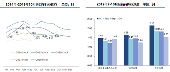 10月,進(jìn)口車經(jīng)銷商庫存深度為1.4個(gè)月,較前兩個(gè)月微升,但仍處于合理區(qū)間;行業(yè)全鏈條庫存回落到3.5個(gè)月,是近五年同期的最低點(diǎn)。流通協(xié)會(huì)方面認(rèn)為,今年進(jìn)口車庫存合理是供需雙降引起的,與2015-2016年去庫存導(dǎo)致的庫存合理有本質(zhì)區(qū)別。