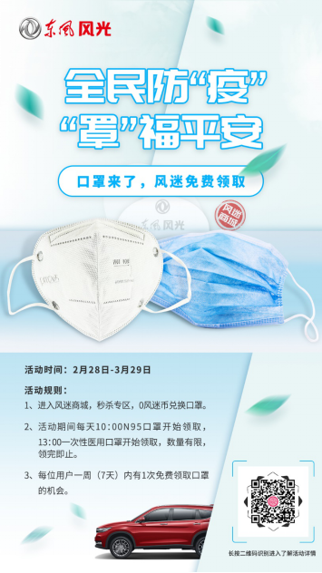 針對(duì)疫情期間“一罩難求”的問(wèn)題,東風(fēng)小康公司推出了“萬(wàn)只口罩限量免費(fèi)領(lǐng)取”活動(dòng),從現(xiàn)在至3月29日,風(fēng)迷商城將每天免費(fèi)送出100份N95、一次性醫(yī)用口罩,為用戶獻(xiàn)上專屬關(guān)愛(ài)。