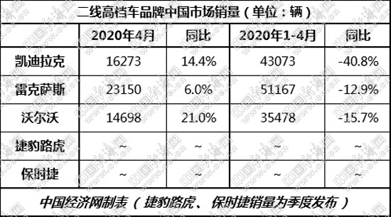 得益于抗疫形勢持續(xù)向好,復(fù)工復(fù)產(chǎn)加快推進,4月二線高檔車市場呈現(xiàn)加速回升之勢。其中,按照月度公布銷量的三大品牌,4月均實現(xiàn)同比正增長,凱迪拉克、沃爾沃增幅更是達到兩位數(shù),而雷克薩斯也有著6%的上升,為二季度發(fā)展奠定良好開局。