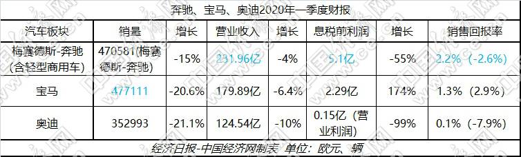 對比來看,寶馬雖未像奔馳一樣受到過多額外因素的影響,但疫情對其帶來沖擊依然不容小覷。一季度,寶馬汽車板塊銷量同比降幅超過兩成,營業(yè)收入也有著6.4%的下滑;不過,由于去年一季度14億歐元反壟斷撥備金的“特別項目”,導(dǎo)致基數(shù)較低,寶馬今年一季度的息稅前利潤以及銷售回報率均實現(xiàn)正向增長。