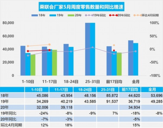 乘聯(lián)會(huì)20日發(fā)布的數(shù)據(jù)顯示,5月第二周(11-17日)的乘用車市場零售表現(xiàn)改善,環(huán)比增長18%,相對前期5月第二周的環(huán)比增長放緩的情況,今年的5月零售走勢回暖的態(tài)勢明顯。