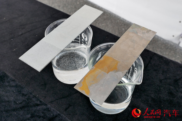 在汽車制造技術(shù)中,車身結(jié)構(gòu)在經(jīng)過焊接成型后,都需要通過電泳池進行鍍鋅工藝,以防止車身在日后使用環(huán)境中被腐蝕,最終得到的“白車身”再進行漆面噴涂工序。記者看到,實驗人員將不鍍鋅鋼板和經(jīng)過鍍鋅鋼板分別放入8%的鹽酸溶液中,放置20秒左右,取出用水沖洗,然后靜置20分鐘,普通鋼板表面出現(xiàn)明顯紅色銹蝕,鍍鋅鋼板表面無明顯銹跡。