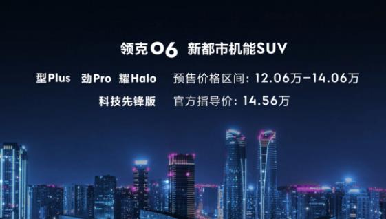 2020年7月24日,領(lǐng)克06于成都車展公布了型Plus、勁Pro、耀Halo三款車型的預(yù)售價格,區(qū)間為12.06-14.06萬,并于7月24日下午16:06于領(lǐng)克商城開啟線上預(yù)訂。同時,首發(fā)600臺科技先鋒版,價格為14.56萬,將于8月6日16:06在領(lǐng)克商城開啟搶訂。