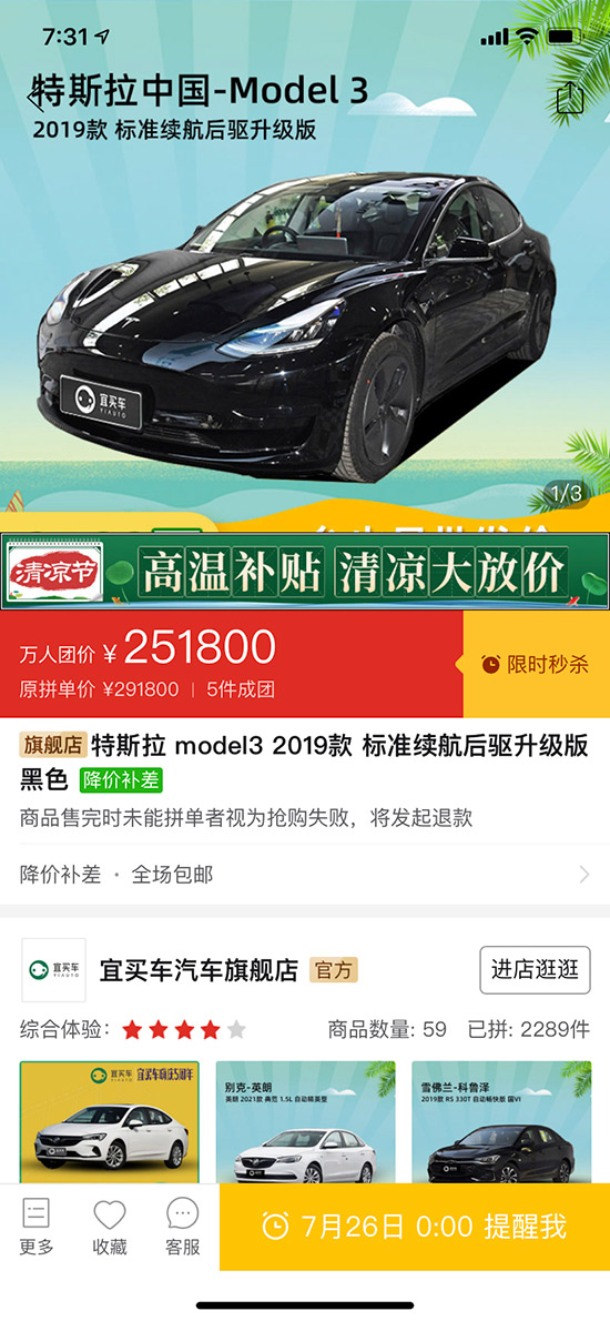 今年7月21日,連鎖汽車銷售平臺宜買車聯(lián)合拼多多推出了一場特斯拉萬人團購活動。活動期間,特斯拉官方指導(dǎo)價為27.155萬元的特斯拉Model 3 標(biāo)準(zhǔn)續(xù)航后輪驅(qū)動升級版 ,在拼多多平臺上的團購價為每臺25.18萬元,團購價格比官方售價便宜了近2萬元。