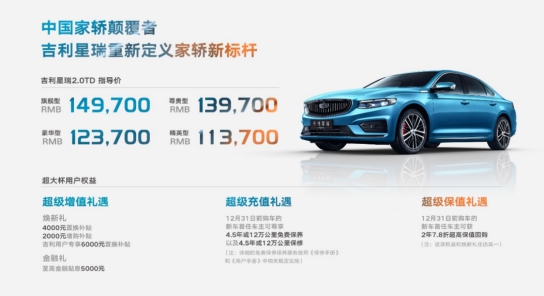除了高價(jià)值的產(chǎn)品和誠(chéng)意十足的價(jià)格,吉利星瑞還為所有用戶推出了豐厚的購(gòu)車豪禮,下單購(gòu)車即可享受4000元置換補(bǔ)貼、2000元增購(gòu)補(bǔ)貼、吉利千萬用戶專享6000元置換補(bǔ)貼等“煥新禮”;同時(shí)還可享至高金融貼息5000元的“金融禮”。在12月31日前購(gòu)車的新車首任車主,可享4.5年或12萬公里免費(fèi)保養(yǎng)以及4.5年或12萬公里保修兩大超值禮遇,還可以獲得2年7.8折超高保值回購(gòu)禮遇(此權(quán)益與煥新禮二選一),充分體現(xiàn)了吉利星瑞對(duì)自身產(chǎn)品實(shí)力的強(qiáng)大自信,切實(shí)踐行“全面超越強(qiáng)勢(shì)合資品牌產(chǎn)品價(jià)值,無需用戶多花一分錢”的承諾。 五大顛覆實(shí)力塑造“價(jià)值超大杯”,定義A級(jí)家轎最高標(biāo)準(zhǔn) 吉利星瑞依托CMA超級(jí)母體打造五大顛覆實(shí)力,塑造“價(jià)值超大杯”,為用戶重新定義家轎市場(chǎng)的智能、健康、動(dòng)力、空間新標(biāo)準(zhǔn),帶來全面超越強(qiáng)勢(shì)合資品牌的產(chǎn)品價(jià)值?;贑MA超級(jí)母體高度靈活的“帶寬”優(yōu)勢(shì),吉利星瑞打破了以往家轎固有的慣性規(guī)則和設(shè)計(jì)限值,以2800mm超長(zhǎng)軸距,1869mm超寬車身和1618mm超寬輪距,顛覆了家轎空間上限,重新定義A級(jí)轎車最大空間標(biāo)準(zhǔn)。