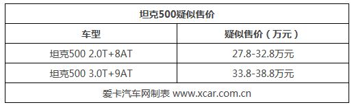 日前,我們獲悉了一組在成都車展上亮相的坦克500的疑似售價,坦克500有望推出2.0T+8AT/3.0T+9AT兩種動力車型。在價格方面,坦克500 2.0T+8AT的疑似售價為27.8-32.8萬元,而3.0T+9AT版本則為33.8-38.8萬元。