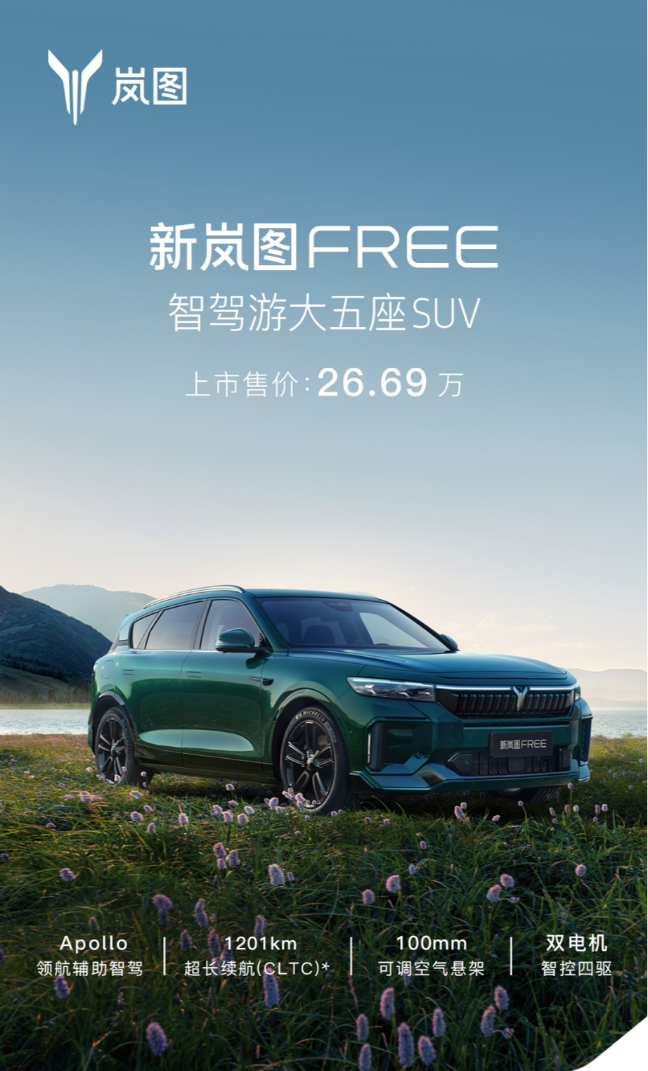 8月19日,新嵐圖FREE在2023 VOYAH NIGHT嵐圖用戶之夜正式上市,售價26.69萬元。新嵐圖FREE采用新外觀、新內(nèi)飾、新動總、新智駕,定位“智駕游大五座SUV”,首搭百度Apollo Highway Driving Pro領(lǐng)航輔助智駕;全系標(biāo)配四驅(qū)系統(tǒng)和空氣懸掛;采用1.5T深度米勒循環(huán)增程器,CLTC綜合續(xù)航里程達(dá)到1201km,純電續(xù)航里程210km,是嵐圖FREE車型自上市以來的首次全面煥新升級。