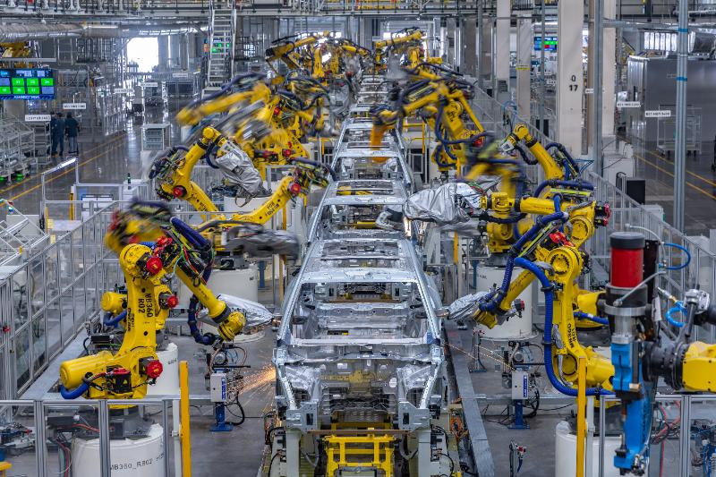(資料圖片)在位于重慶兩江新區(qū)的賽力斯超級(jí)工廠,焊裝車(chē)間生產(chǎn)線(xiàn)上的機(jī)器人在精準(zhǔn)執(zhí)行作業(yè)指令。新華社記者 黃偉 攝