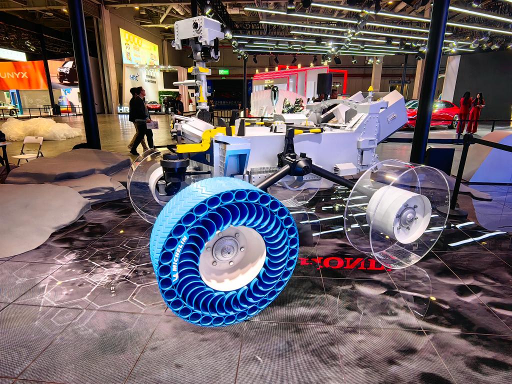 進(jìn)博會期間,米其林將亞洲首發(fā)一款月球探測車專用的免充氣輪胎。新華社記者周蕊 攝