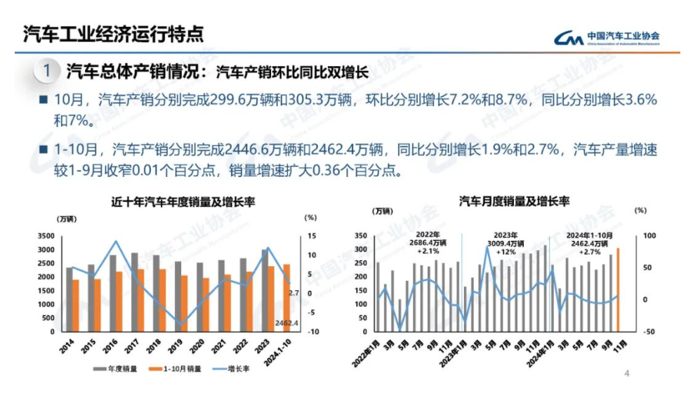 中汽協(xié)發(fā)布數(shù)據(jù)顯示,10月,汽車產(chǎn)銷分別完成299.6萬輛和305.3萬輛,環(huán)比分別增長7.2%和8.7%,同比分別增長3.6%和7%。1-10月,汽車產(chǎn)銷分別完成2446.6萬輛和2462.4萬輛,同比分別增長1.9%和2.7%,汽車產(chǎn)量增速較1-9月收窄0.01個百分點,銷量增速擴(kuò)大0.36個百分點。