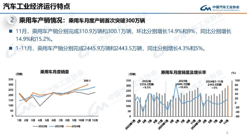 乘用車月度產(chǎn)銷首次突破300萬輛。11月,乘用車產(chǎn)銷分別完成310.9萬輛和300.1萬輛,環(huán)比分別增長14.9%和9%,同比分別增長14.9%和15.2%。1—11月,乘用車產(chǎn)銷分別完成2445.9萬輛和2443.5萬輛,同比分別增長4.3%和5%。