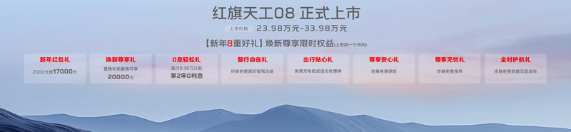 逐夢新程,臻享超值。天工08共推出兩驅(qū)和四驅(qū)2種驅(qū)動模式共5個(gè)版本供選擇,官方指導(dǎo)價(jià)為23.98萬元-33.98萬元。同時(shí),購買天工08的消費(fèi)者還可尊享“新年8重好禮”限時(shí)權(quán)益,即刻購車可享2000元抵17000元的新年紅包禮;置換補(bǔ)貼最高可享20000元的換新尊享禮;首付8.98萬元起、享2年0利息的0息輕松禮;終身免費(fèi)高階智駕功能的智行自在禮;免費(fèi)充電樁或組合優(yōu)惠券的出行貼心禮;終身免費(fèi)保修的尊享安心禮;終身免費(fèi)保養(yǎng)的尊享無憂禮;終身免費(fèi)救援及取送車的全時(shí)護(hù)航禮。從購車成本到金融方案,再到智駕裝備、質(zhì)量保障等方方面面,紅旗以超值權(quán)益帶來進(jìn)階的價(jià)值體驗(yàn),讓用戶買得舒心、用得安心。