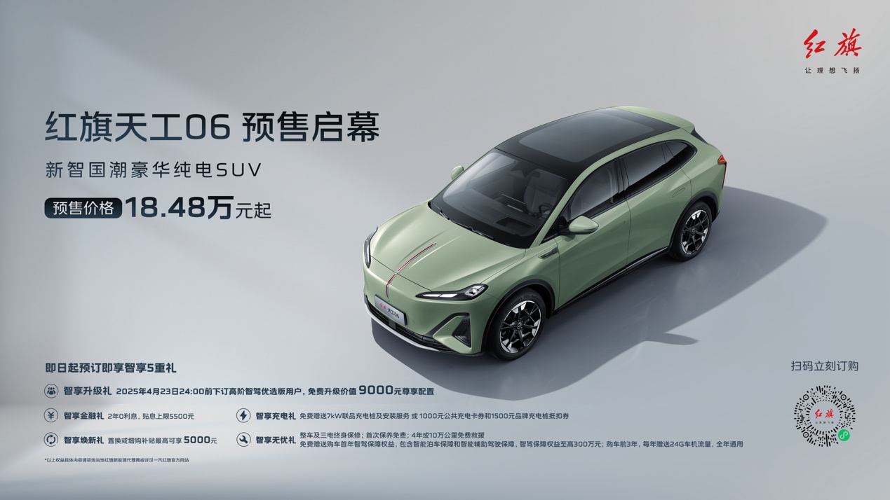天工06定位新智國潮豪華純電SUV,除搭載了與天工05相同的司南智駕系統(tǒng)和靈犀座艙外,還配備了專屬超級適時(shí)智能四驅(qū)系統(tǒng),擁有毫秒級的四驅(qū)介入響應(yīng),既可為用戶提供卓越的四驅(qū)駕乘體驗(yàn),又能讓用戶享受兩驅(qū)的極低電耗。此次紅旗品牌智能體驗(yàn)日天工06正式開啟預(yù)售,預(yù)售價(jià)格18.48萬元起,并帶來豐厚的“智享五重禮”預(yù)訂權(quán)益。
