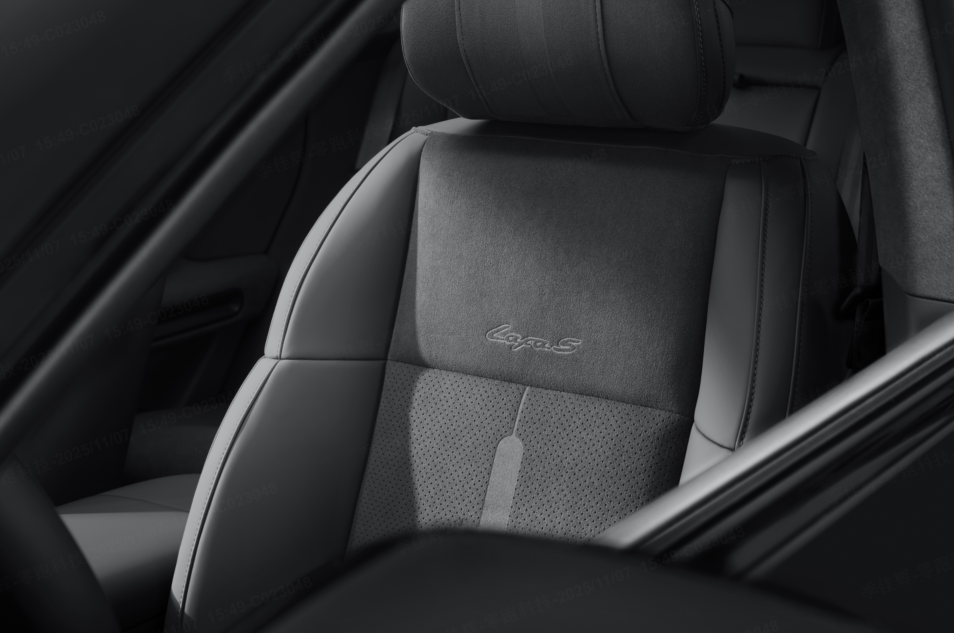 內(nèi)飾配色提供速域紫、馳影灰、競速灰三種選擇,速域紫夜色霓虹與尾焰的顏色,極具時(shí)尚與運(yùn)動(dòng)感;馳影灰靈感源于賽道柏油的中性灰調(diào),理性而不平庸;競速灰質(zhì)感運(yùn)動(dòng)、出眾,采用5.54㎡仿麂皮超纖絨與Nappa全粒面真皮拼接,座椅上“延伸賽道”紋理與“Lafa5”專屬字標(biāo)燙印,在細(xì)節(jié)處彰顯豪華運(yùn)動(dòng)質(zhì)感。