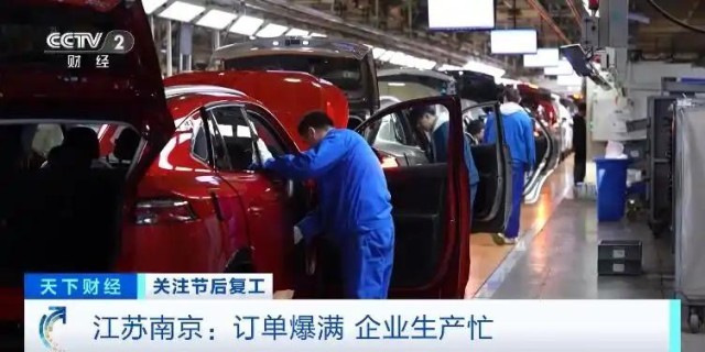 在南京市江北新區(qū)的一家大型汽車生產企業(yè),其中一個車間面積4萬平方米,產線從腳下延伸到了頭頂,工作人員正在緊張忙碌著,一輛輛嶄新的汽車高效地走向流水線。這里每天可以生產汽車1000輛左右。一些剛剛上市的新款新能源汽車產品,銷售非常火爆,訂單已經排到了今年下半年。正月初五這里已經全員在崗趕訂單。這個車間,每天兩個班組,1200多名工人日夜在崗,這個數字是去年春節(jié)同期的2.5倍。
