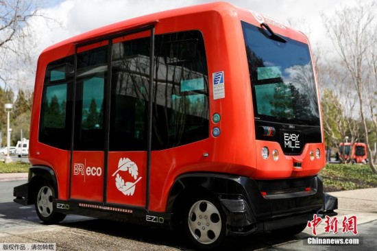 當(dāng)?shù)貢r間3月6日,美國加州畢曉普蘭奇,法國EasyMile公司生產(chǎn)的無人駕駛公交車EZ10正在當(dāng)?shù)夭渴饻y試。