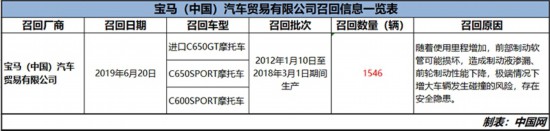 同時,寶馬(中國)汽車貿(mào)易有限公司自即日起召回2012年1月10日至2018年3月1日期間生產(chǎn)的進口C650GT、C650SPORT、C600SPORT摩托車,共計1546輛。