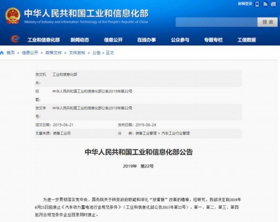 6月24日,工信部正式發(fā)布了一則公告,明確表示自今年6月21日起,廢止《汽車(chē)動(dòng)力蓄電池行業(yè)規(guī)范條件》(工業(yè)和信息化部公告2015年第22號(hào)),同時(shí)廢止的還有第一、第二、第三、第四批符合規(guī)范條件企業(yè)目錄。全國(guó)乘用車(chē)市場(chǎng)信息聯(lián)席會(huì)秘書(shū)長(zhǎng)崔東樹(shù)在接受《中國(guó)汽車(chē)報(bào)》記者采訪時(shí)表示,此舉意味著,在業(yè)內(nèi)存在近4年的新能源汽車(chē)動(dòng)力電池“白名單”正式取消,國(guó)內(nèi)動(dòng)力電池領(lǐng)域?qū)⒂瓉?lái)新一輪的競(jìng)爭(zhēng)。