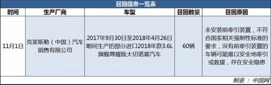 本次召回范圍內(nèi)的車輛未安裝前牽引裝置,不符合國(guó)家相關(guān)強(qiáng)制性標(biāo)準(zhǔn)的要求,沒有前牽引裝置的車輛可能難以安全地牽引或救援,存在安全隱患??巳R斯勒(中國(guó))汽車銷售有限公司將為召回范圍內(nèi)的車輛免費(fèi)提供前牽引環(huán)并將牽引環(huán)支架安裝到車輛上,同時(shí)換上帶孔的車前下部格柵,以消除安全隱患。