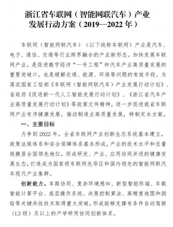 推動(dòng)智能網(wǎng)聯(lián)發(fā)展的,除了技術(shù),還有政策?!凹涌彀l(fā)展智能網(wǎng)聯(lián)產(chǎn)業(yè),是促進(jìn)數(shù)字經(jīng)濟(jì)‘一號(hào)工程’和汽車產(chǎn)業(yè)高質(zhì)量發(fā)展的重要突破口,也是緩解交通、能源、環(huán)保等問題的有效手段。”近日,浙江省經(jīng)濟(jì)和信息化廳、科技廳、交通運(yùn)輸廳聯(lián)合印發(fā)《浙江省車聯(lián)網(wǎng)(智能網(wǎng)聯(lián)汽車)產(chǎn)業(yè)發(fā)展行動(dòng)方案(2019-2022 年)》(以下簡稱《方案》)中所指出的,正是發(fā)展智能網(wǎng)聯(lián)的意義所在。