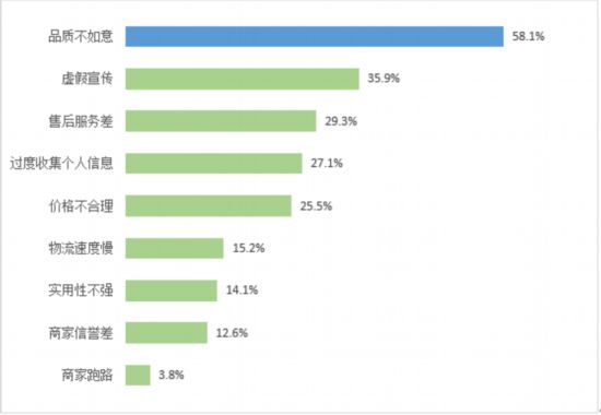 56.5%的受訪者表示對當(dāng)前的消費(fèi)環(huán)境比較放心或非常放心。58.1%的受訪者對當(dāng)前商品/服務(wù)不滿意的首要原因是“品質(zhì)不如意”,“虛假宣傳”也是受訪者反映較為集中的不滿意原因,占比超過35.9%?!笆酆蠓?wù)差”(29.3%)、“過度收集個人信息”(27.1%)等方面也是造成受訪者對現(xiàn)有消費(fèi)商品和服務(wù)不滿意的重要原因。