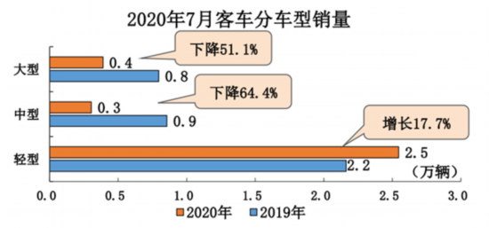 從細(xì)分車(chē)型來(lái)看,7月,大型客車(chē)銷(xiāo)0.4萬(wàn)輛,環(huán)比下降37.7%,同比下降51.1%;1-7月,大型客車(chē)銷(xiāo)2.7萬(wàn)輛,同比下降33.8%。中型客車(chē)銷(xiāo)0.3萬(wàn)輛,環(huán)比下降27.0%,同比下降64.4%;1-7月,中型客車(chē)銷(xiāo)2.0萬(wàn)輛,同比下降44.3%。輕型客車(chē)銷(xiāo)2.5萬(wàn)輛,環(huán)比下降21.9%,同比增長(zhǎng)17.7%;1-7月,輕型客車(chē)銷(xiāo)17.0萬(wàn)輛,同比下降1.7%。