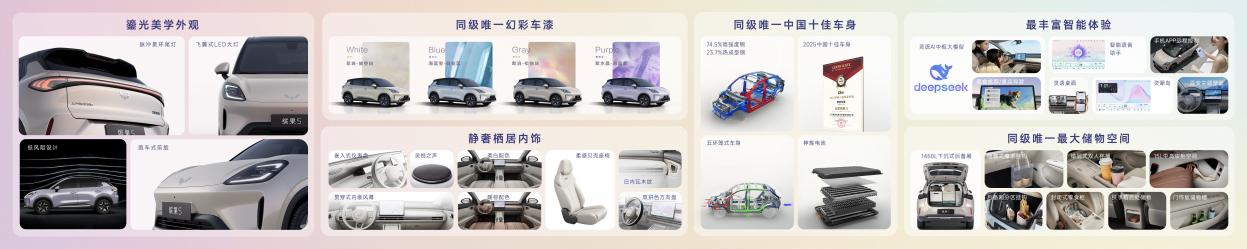 步入“舒嶼座艙”,細(xì)節(jié)皆巧思。繽果S以“靜奢棲居美學(xué)”為靈感,通過(guò)環(huán)抱式布局、貫穿式內(nèi)嵌風(fēng)幕與柔感貝殼座椅等設(shè)計(jì),營(yíng)造出沉浸式的舒適氛圍。搭配同級(jí)唯一的6揚(yáng)聲器系統(tǒng)與阿嘉米斯專業(yè)聲場(chǎng)調(diào)校,進(jìn)一步提升了座艙的靜謐質(zhì)感與聽(tīng)覺(jué)享受。12.8英寸高清大屏內(nèi)置“1+N”靈語(yǔ)AI中樞大模型,深度融合DeepSeek大模型,以更全面的壁紙玩法、八大區(qū)域的方言溝通、更多的智能場(chǎng)景應(yīng)用,為用戶帶來(lái)真正“更懂你的”智能座艙體驗(yàn)。