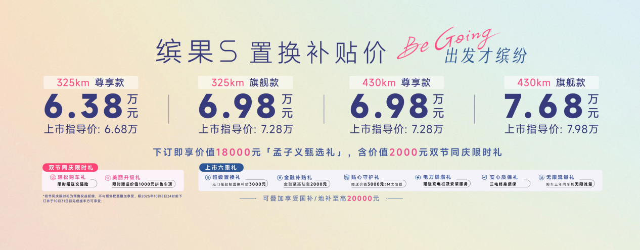 繽果S共推出325km尊享款、325km旗艦款、430km尊享款、430km旗艦款四款配置,上市指導(dǎo)價(jià)為6.68萬(wàn)-7.98萬(wàn)元,疊加置換政策可享置換補(bǔ)貼價(jià)6.38萬(wàn)-7.68萬(wàn)元,更可疊加享受至高20,000元的國(guó)家/地方購(gòu)車補(bǔ)貼。