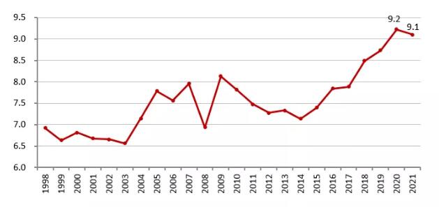 中新經緯2月10日電 易居研究院10日發(fā)布的報告顯示,2021年,全國商品住宅房價收入比為9.1,相比2020年的9.2小幅回落;2022年房價收入比預計將繼續(xù)回落至8.7左右。