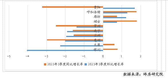 緯房研究院數據顯示,重點40城中,僅有10個城市住房租金環(huán)比上升,其余30個城市住房租金均環(huán)比下降。其中,租金上漲的城市增幅也并不可觀,環(huán)比增長率大多不到1%。租金下跌的30城中,12個城市租金跌幅在1%以內,12個城市跌幅在1%-2%之間,6個城市跌幅超過2%。與2022年三季度末相比,重點40城中16個城市住房租金同比上漲,24個城市同比下降。其中,3個城市同比增長超過2%,13個城市同比漲幅在2%以內,12個城市同比跌幅在2%以內,11個城市同比跌幅在2%-4%之間,1個城市同比跌幅超過4%。