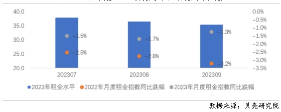 圖6 2023年三季度重點40城月度租金水平及月度租金指數變化