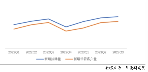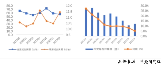 根據貝殼研究院數據,全國重點40城三季度房客源成交周期分別為56.7、11.5天,房源成交周期環(huán)比減少2.1天,同比增加2.7天;客源成交周期環(huán)比延長1天,同比延長1天。隨著個人租賃房源供應的增加,疊加保障性租賃住房、市場化集中式租賃房源的增加,個人業(yè)主出租房源出租速度減緩。從庫存房源來看,今年1-9月租賃庫存房源量均呈現(xiàn)同比增加的趨勢,與此同時,租客租房面臨的選擇項增多,租客對于租賃房源可選類型和房源量均有增加。