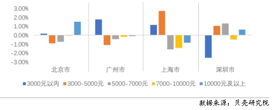 貝殼研究院數據顯示,一線城市呈現(xiàn)不同程度的重心下移,同時北京、深圳還呈現(xiàn)出延遲購房“購轉租”的特征,高套均支出區(qū)間的租賃房源成交增加。上海和廣州租賃重心下移態(tài)勢明顯。上海套均租金5000元以內的成交占比增加了將近4個百分點,5000元以上的占比均呈現(xiàn)減少趨勢,尤其是套均租金在5000-10000元區(qū)間的房源占比;廣州套均租金在3000元以內的增加了1.8個百分點,3000元以上的均呈現(xiàn)減少趨勢。