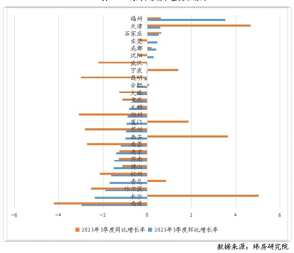 住房大數據監(jiān)測的26個二線城市中,僅有6個城市的住房租金環(huán)比上漲,20個城市的住房租金環(huán)比下跌。其中,南通和長沙降幅最高,分別為2.97%和2.36%,其余城市降幅均不超過2%;福州漲幅最高為3.53%,其余城市漲幅均不超過1%。與2022年三季度末相比,住房大數據監(jiān)測的26個二線城市中有16個城市住房租金同比下降,10個城市住房租金同比上漲。其中,南通、鄭州、昆明等城市住房租金同比跌幅最大,分別下跌4.23%、3.09%和3%;長沙、天津、西安等城市住房租金同比漲幅最大,分別上漲5.03%、4.66%和3.65%。