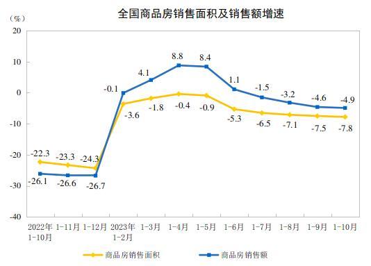 1—10月份,商品房銷(xiāo)售面積92579萬(wàn)平方米,同比下降7.8%,其中住宅銷(xiāo)售面積下降6.8%。商品房銷(xiāo)售額97161億元,下降4.9%,其中住宅銷(xiāo)售額下降3.7%。