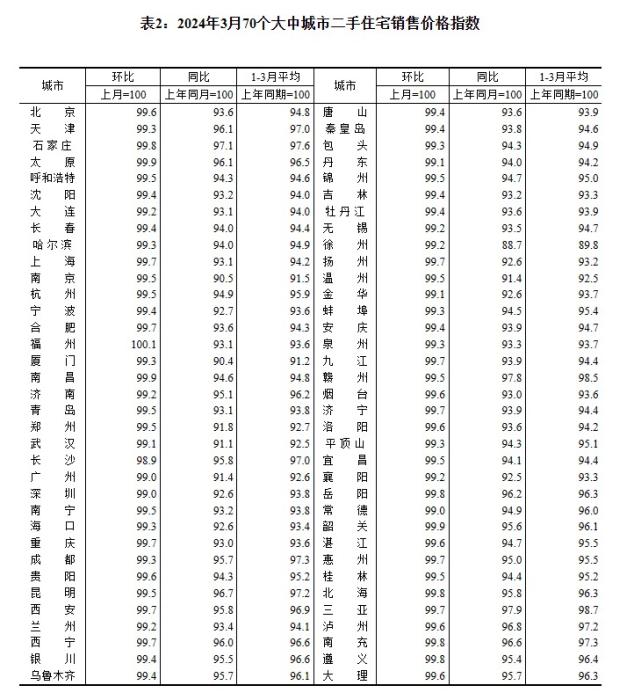 2024年3月70個大中城市二手住宅銷售價格指數(shù)。 截圖自國家統(tǒng)計(jì)局官網(wǎng)