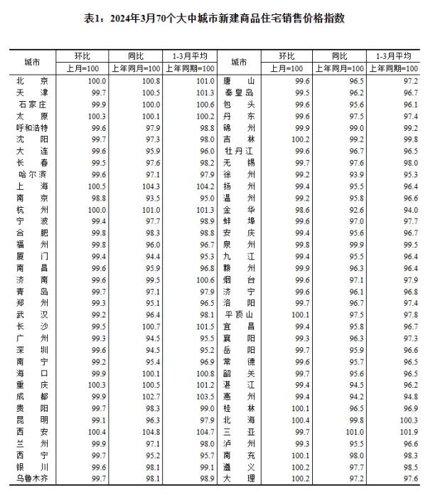 2024年3月70個大中城市新建商品住宅銷售價格指數(shù)。 截圖自國家統(tǒng)計(jì)局官網(wǎng)