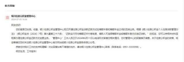 收到留言后,銀川住房公積金管理中心作出公開(kāi)回復(fù)?;貜?fù)稱:經(jīng)查,銀川住房公積金管理中心現(xiàn)已開(kāi)通住房公積金貸款還款方式在等額本息和等額本金之間的互轉(zhuǎn)業(yè)務(wù)。網(wǎng)友可以持相關(guān)材料至柜面辦理住房公積金還款方式變更業(yè)務(wù)。