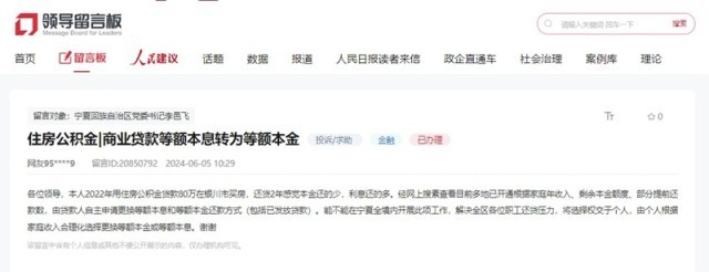 該網(wǎng)友上網(wǎng)查詢得知,目前多地已開(kāi)通還款方式在等額本息與等額本金之間互轉(zhuǎn)的業(yè)務(wù),借款人可自主申請(qǐng)更換等額本息和等額本金還款方式(包括已發(fā)放貸款),希望寧夏相關(guān)部門也可以開(kāi)展此項(xiàng)工作,解決全區(qū)各位職工還貸壓力。