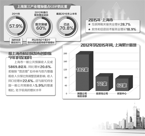 “營(yíng)改增方案出臺(tái)前,正在制定‘十二五’規(guī)劃的上海,遇到發(fā)展‘瓶頸’?!焙ū硎荆@在產(chǎn)業(yè)結(jié)構(gòu)上表現(xiàn)得尤為明顯。2011年,上海第三產(chǎn)業(yè)增加值占GDP的比重為57.9%,當(dāng)時(shí)北京接近80%?!皩?duì)上海來(lái)說(shuō),要想謀求強(qiáng)勁的可持續(xù)發(fā)展,必須優(yōu)化產(chǎn)業(yè)結(jié)構(gòu),發(fā)展現(xiàn)代服務(wù)業(yè)、提高第三產(chǎn)業(yè)的比重。恰在此時(shí),營(yíng)改增帶來(lái)了契機(jī)。”胡怡建說(shuō)。