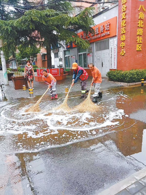 一次雨后,八角北路社區(qū)內,石房物業(yè)工作人員在清理積水。