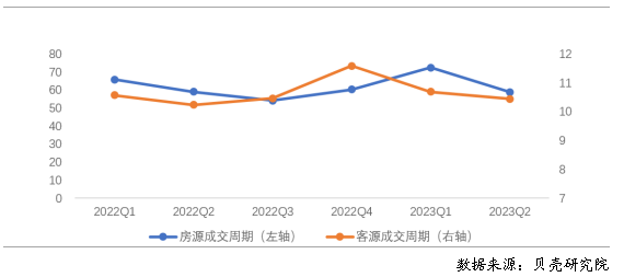 房客源活躍度提升,房屋出租周期先升后降。根據(jù)貝殼研究院數(shù)據(jù),2023年上半年重點(diǎn)40城新增掛牌房源量、新增帶看客戶量同比、環(huán)比均增加超過9%。房源端、客源端活躍度均保持上升的趨勢。2023年上半年重點(diǎn)40城房客源成交周期分別為65.0天、10.5天。相比于去年,今年上半年房源成交周期總體有所延長。從季度來看,房源供應(yīng)量的增加同時(shí)使得2023年一季度房屋出租周期比2022年四季度上升12.1天,但2023年二季度房源成交周期比一季度縮短13.6天,出房速度有所加快。從客源端來看,一、二季度客源成交周期連續(xù)縮短,顯示出租客的租房難度在降低,可選擇房源量較多,有利于租客選擇匹配自身需求的房源。