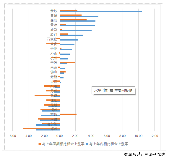 二線城市上半年住房租金漲跌參半,但多數(shù)城市未達(dá)到去年同期水平。與上年末相比,住房大數(shù)據(jù)監(jiān)測的26個(gè)二線城市中,有10個(gè)城市住房租金下降,16個(gè)城市住房租金上漲。其中,鄭州、哈爾濱、南昌等城市的住房租金降幅最大;長沙、青島、西安、天津、成都等城市漲幅在4%以上。