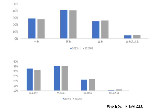 上半年租賃成交中兩居室、60-90平米房源占比最高。根據(jù)貝殼研究院數(shù)據(jù),2023年上半年重點(diǎn)40城兩居室成交占比最高,占比40.8%,其次為一居室,占比27.9%;租賃成交中面積段為60-90平米的占比達(dá)到35.2%,其次為60平米以下,占比為31.5%。對比去年同期,2023年上半年租賃成交結(jié)構(gòu)相對穩(wěn)定,租客對于一居室、兩居室的小戶型租賃房源需求仍保持旺盛。一居室或60平米以下的占比略有減少,部分對一居室有需求的租客或轉(zhuǎn)向了租賃集中式長租公寓,尤其是保障性租賃住房。
