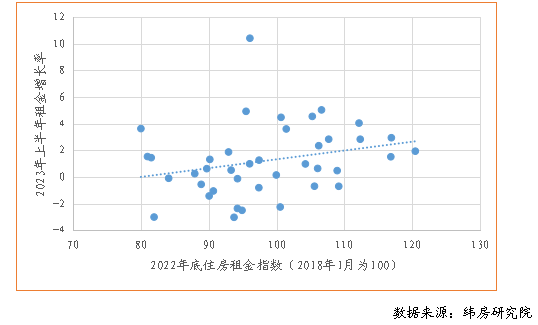 圖9 2023年上半年重點(diǎn)40城住房租金增長率與2022年底住房租金指數(shù)關(guān)系