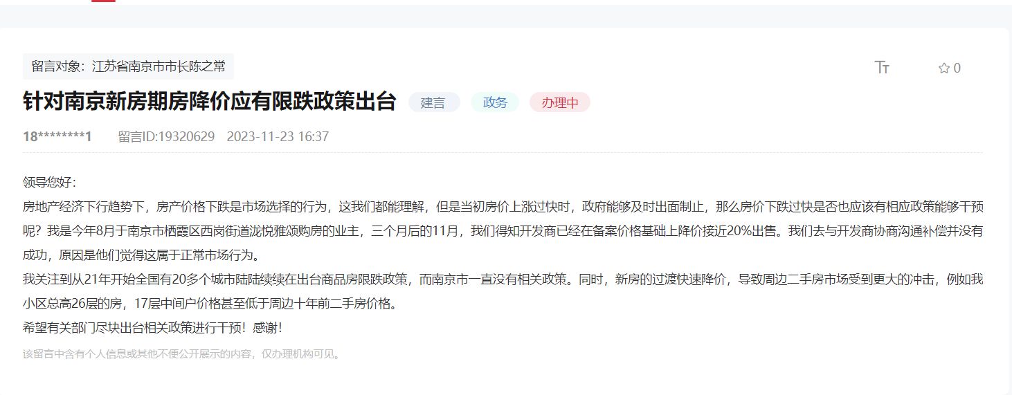 在領導留言板上,11月23日,有網(wǎng)友表示“針對南京新房期房降價應有限跌政策出臺”。該網(wǎng)友留言道,“房地產(chǎn)經(jīng)濟下行趨勢下,房產(chǎn)價格下跌是市場選擇的行為,這我們都能理解,但是當初房價上漲過快時,政府能夠及時出面制止,那么房價下跌過快是否也應該有相應政策能夠干預呢?我是今年8月于南京市棲霞區(qū)西崗街道瀧悅雅頌購房的業(yè)主,3個月后的11月,我們得知開發(fā)商已經(jīng)在備案價格基礎上降價接近20%出售。我們去與開發(fā)商協(xié)商溝通補償并沒有成功,原因是他們覺得這屬于正常市場行為。 我關注到從21年開始全國有20多個城市陸陸續(xù)續(xù)在出臺商品房限跌政策,而南京市一直沒有相關政策。同時,新房的過度快速降價,導致周邊二手房市場受到更大的沖擊,例如我小區(qū)總高26層的房,17層中間戶價格甚至低于周邊十年前二手房價格?!?/p>