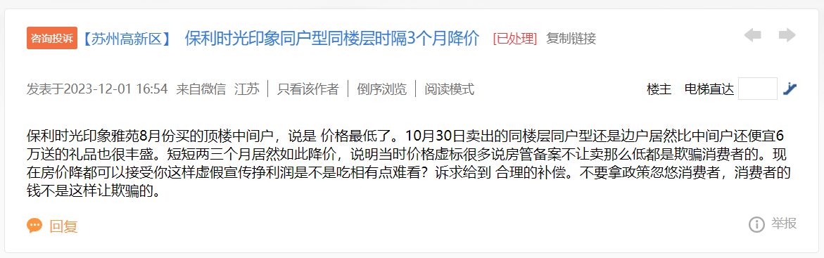 澎湃新聞在蘇州陽光便民網(wǎng)上看到,12月1日,有網(wǎng)友留言表示:蘇州高新區(qū)保利時光印象雅苑項目,“8月份買的頂樓中間戶,說是價格最低了。10月30日賣出的同樓層同戶型還是邊戶,居然比中間戶還便宜6萬元,送的禮品也很豐盛。短短兩三個月居然如此降價,說明當時價格虛標。”